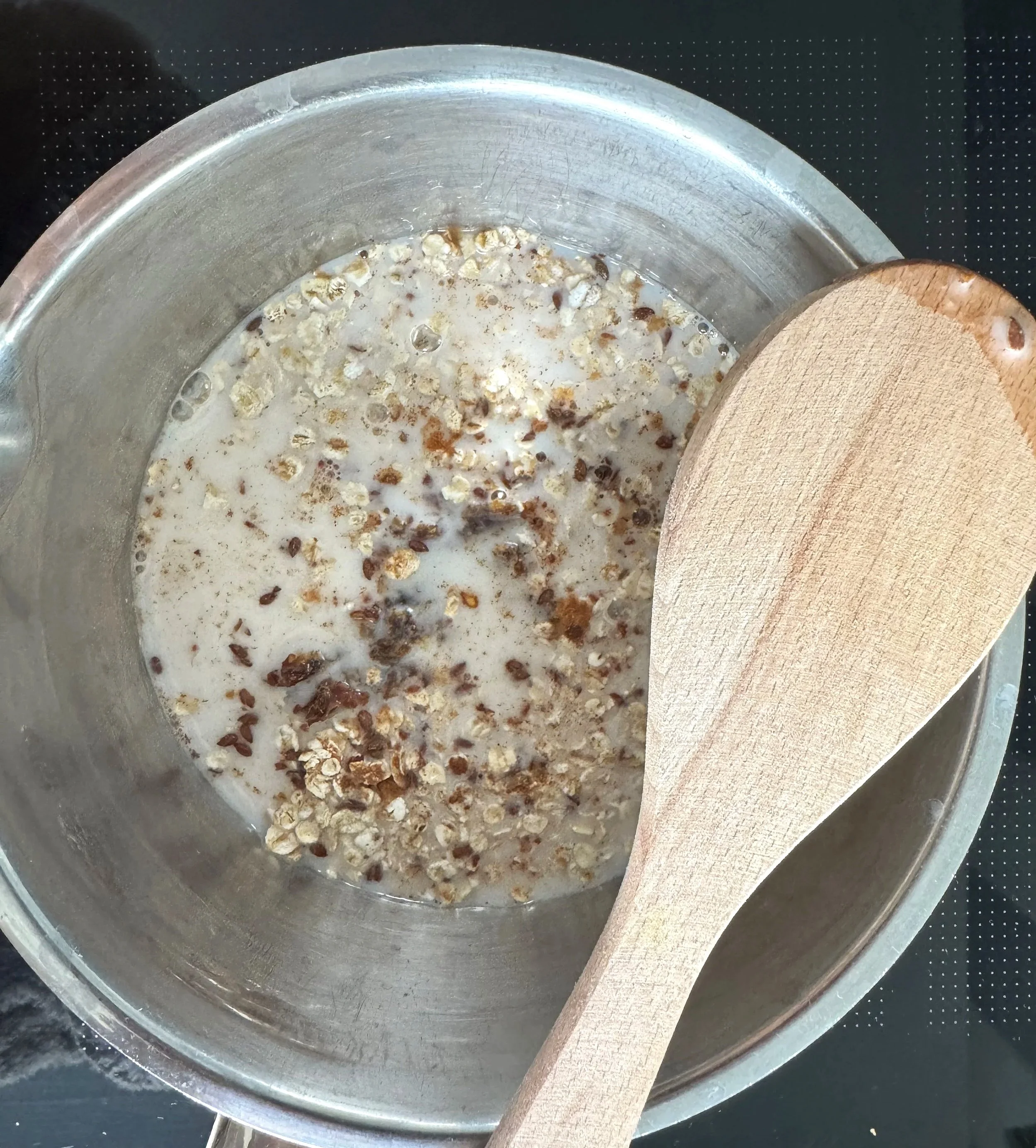 Into a small saucepan, add your oats, flax seeds, cinnamon, chopped dates, milk, vanilla and a pinch of salt if desired