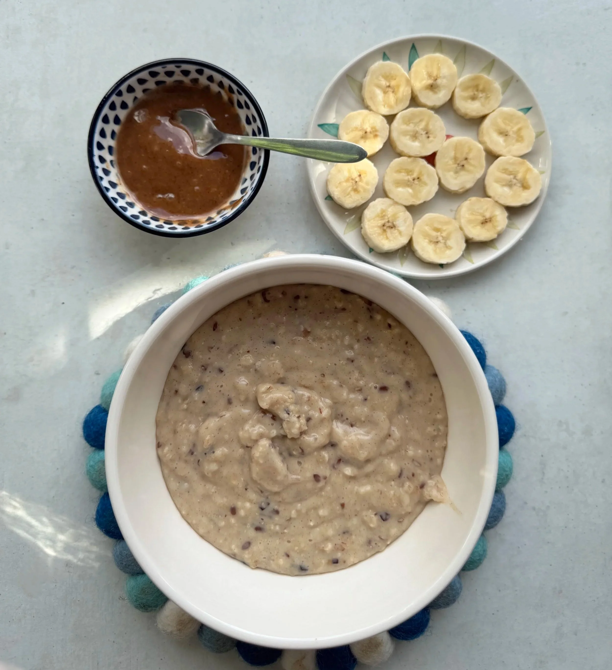 You can of course add all of the toppings on all at once, however, I like to serve along side and as I’m eating add pieces of banana and dollops of sauce on top. In that way, I get to enjoy the various flavours in every bite, right to the very end of my bowl of porridge!!
