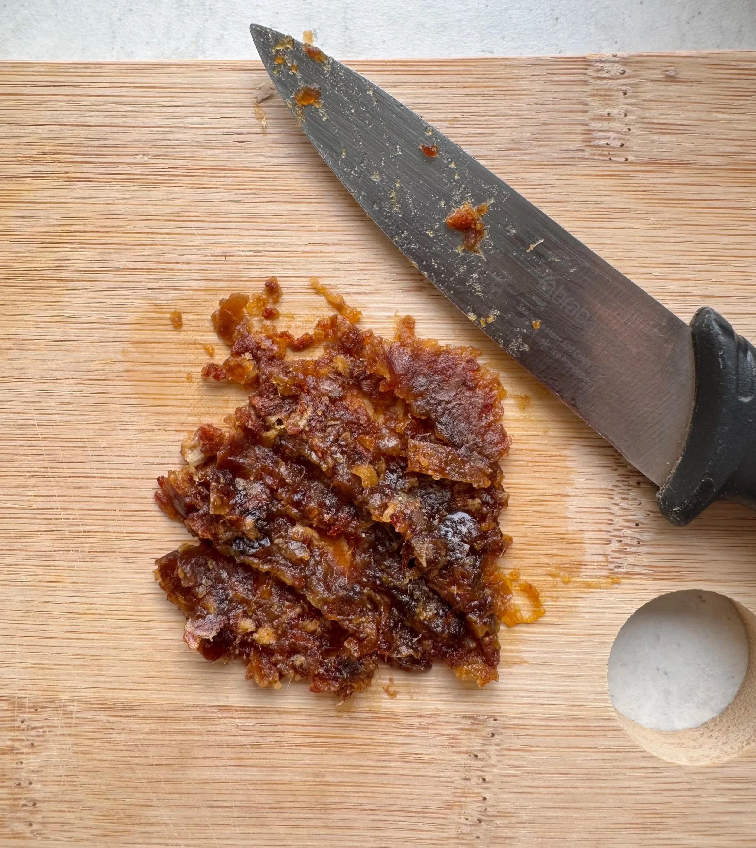 Once that dates have had the time to rehydrate, remove them from the boiling water, and finely chop (almost forming them into a paste).