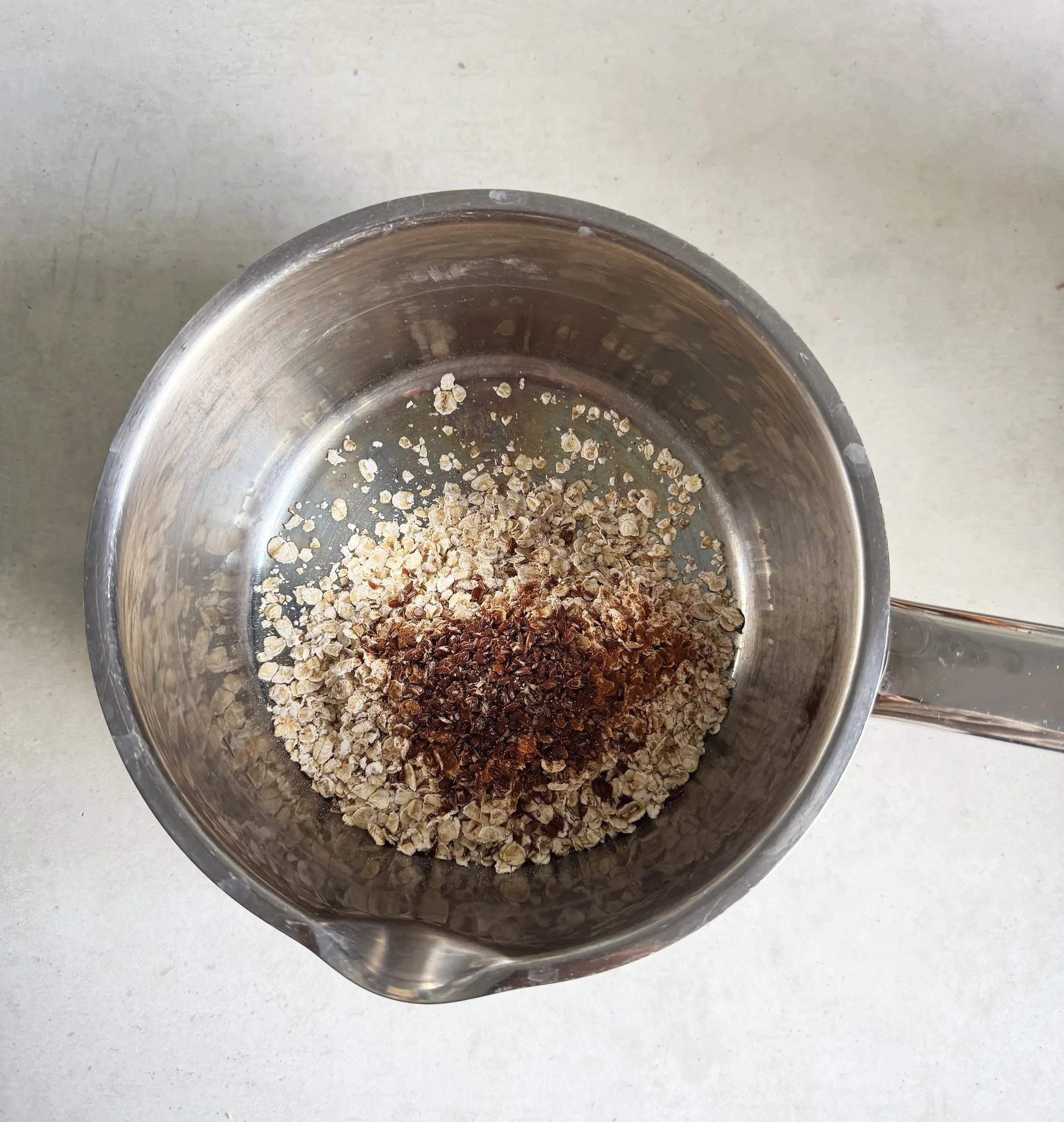 I then begin to measure out the rest of the ingredients for the porridge base whilst allowing the dates to soften. The rolled oats, flax seeds, vanilla extract, a pinch of salt and cinnamon (if desired) are added to a pan.