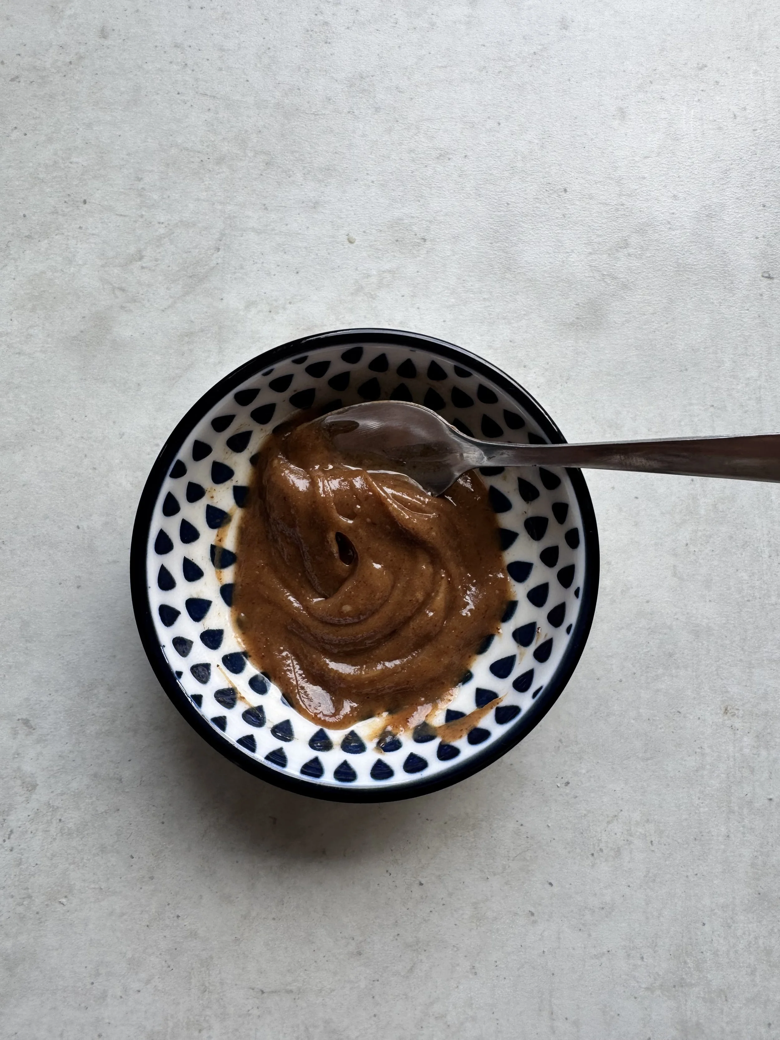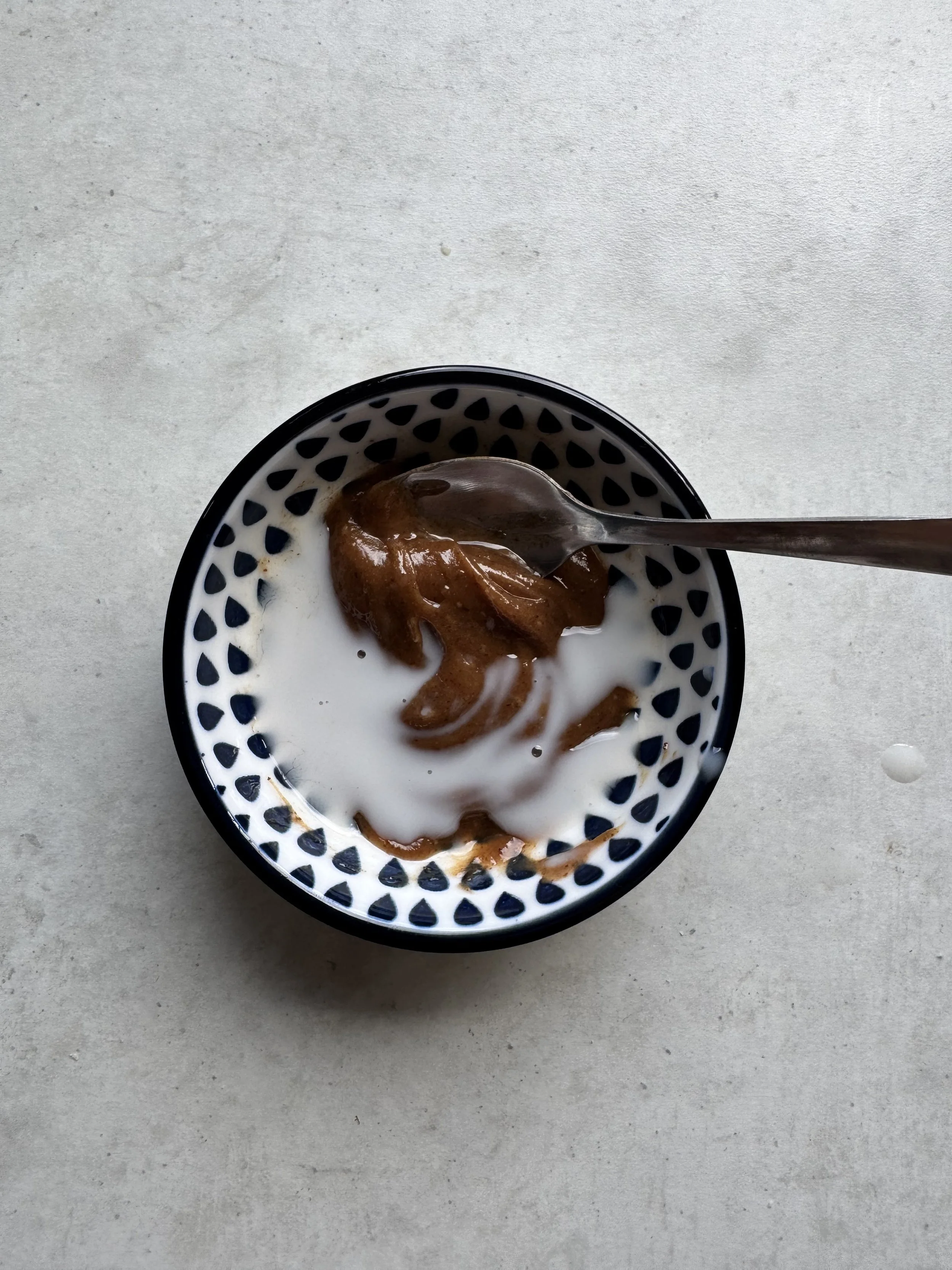 Whilst your oats are cooking, in a bowl, mix your but butter and maple syrup to form your “toffee sauce”. Add a splash of milk to loosen.