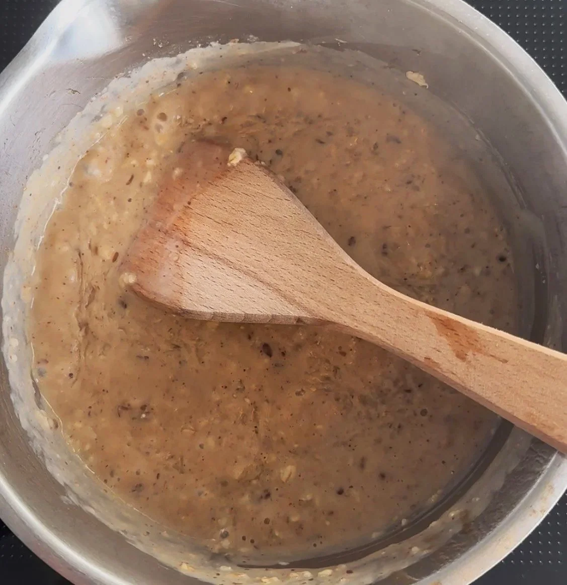 Cook on a low heat, until the milk is almost fully been absorbed by the oats, then add splashes of water to further cook the porridge base, until it reaches your desired conistency.