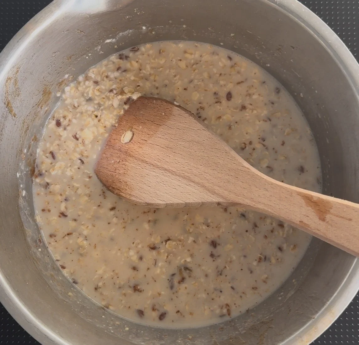 Tip the oats, flax seeds, ground almonds, almond extract, milk and almond butter into the same pan